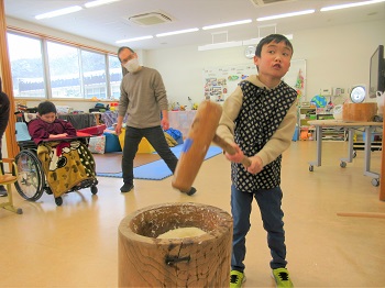 A組や6年生の友達も加わって、みんなで餅をつきました。