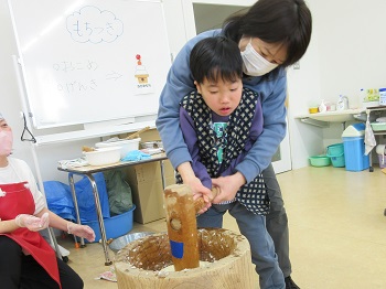 臼にふかした餅米を入れたら、杵を使ってつきます。木製の杵は、ずっしり重いですが、しっかりと握ってつきました。友達や先生が、餅をつくタイミングに合わせて、掛け声をかけると、気持ちも軽くテンポよくつくことができました。