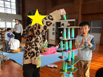 そこで、昨年末から舞鶴市子育て応援課子育て支援係長兼あそびあむ所長様や「あそびあむ」のスタッフの方々との打ち合わせを行い、ついに今日、「出張あそびあむ」を実施することができました。