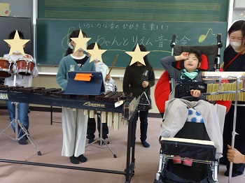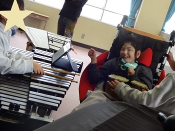 居住地校の友達との学習は、本児にとってとても楽しい様子で、音楽の音色や友達の声をよく聴き、よく話すこともできました。