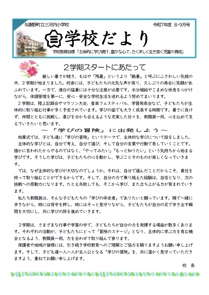 令和7年度 学校だより 8・9月 Twitter Facebook はてブ Pocket LINE コピー 2025.09.01 【三河内小】8・9月学校だよりダウンロード Post Views: 85