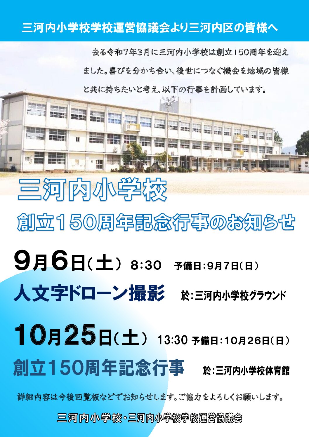 三河内小学校 創立150周年 記念行事を開催します! Twitter Facebook はてブ Pocket LINE コピー 2025.09.02 (カラー版)学校運営協議会地域配布ダウンロード Post Views: 125