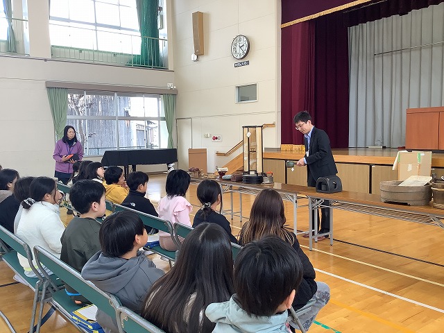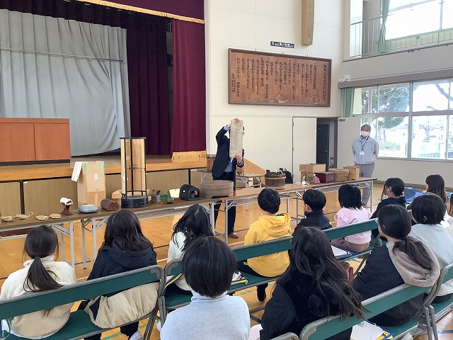 山城郷土資料館の方々をお招きし、昔使われていた道具(洗濯板やアイロン、まくら、あんどんなど)についてのお話を聞きました。子どもたちは、今の暮らしとの違いに驚き、思わず「えーっ!」「そうなん!?」という声がもれていました。