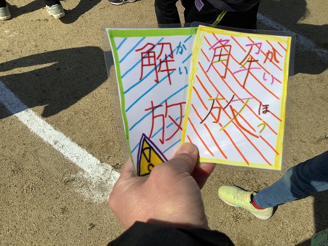 児童会主催で全校遊びがとり行われました。「ハンターおにごっこ」ということで、運動場には、黒ずくめのハンターまで登場しました。一度つかまってしまった人も逃げられる「解放カード」を準備するなど、工夫がこらされた内容に子どもたちは、笑顔で楽しんでいました。