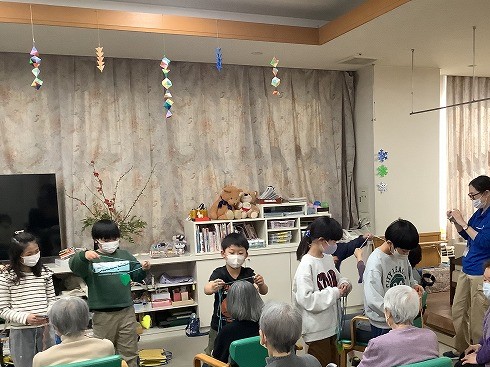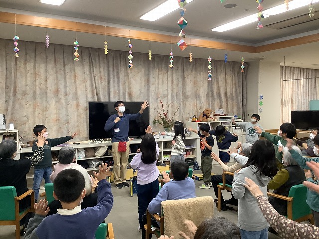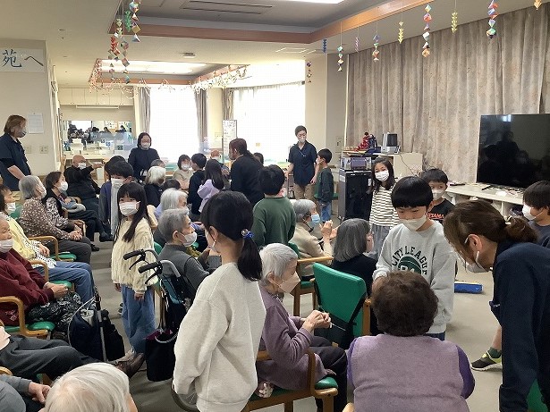 高齢者の皆さんと交流することを目的として楽生苑を訪問させていただきました。入所者の皆さんの日頃の生活について学んだ後、一緒に「ぼくらはみんな生きている」「ゆうやけこやけ」の歌を歌ったり、「ずいずいずっころばし」の手遊びで遊んだりしました。最後には、2年生が作ったハート型の折り紙ペンダントをプレゼントしました。