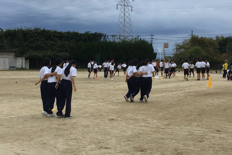 ラジオ体操後、玉入れ、2人3脚の入退場の練習を行いました。