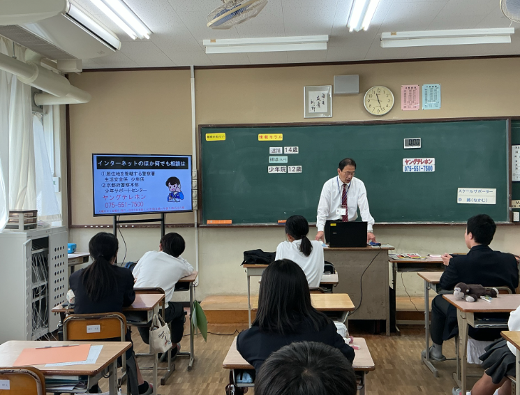20日(月)の3時間目に、城陽警察の方に講師としてきて頂いて、情報モラル講座を行いました。主に、SNSやスマートフォンを扱う上でのトラブルについて学びました。撮った写真にはたくさんの情報が載っていること、安易に写真を送ることによって巻き込まれるトラブル、Line上での言葉のやりとりでは相手の感情が見えにくく危険であること、そして、今後は自身に責任がとわれるようになること。今は、簡単に加害者にも被害者にもなりうる時代です。スマートフォンの画面の奥には、見えない相手の顔や思いがあります。自分も相手も守れるよう、今日習った中身を今後に活かしていきましょう。