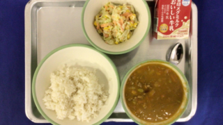 【今日の献立】"豆のオリンピックカレー" 牛乳 "コールスロールサラダ"