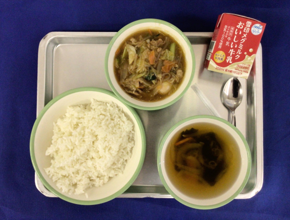 【今日の献立】”中華丼” ”牛乳” ”わかめスープ”