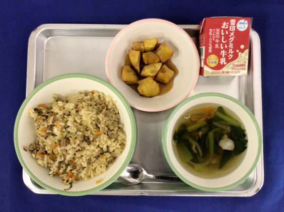 ●今日の献立の「大学芋」の由来は諸説あって、東京大学赤門前にあったお店が人気だった説、大学生が学費を払うために安く手に入るさつまいもを加工して売った説などあるそうです。油でカラッと揚げたさつまいもは甘くて香ばしく和風のスイーツの代表選手です。秋を感じながらいただきました。