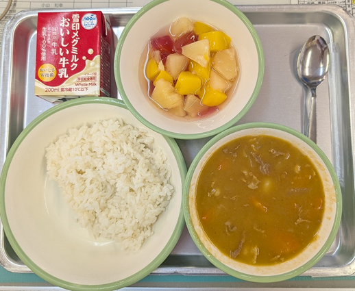 きょうの給食【今日の献立】ポークカレー、牛乳、ゼリー入りフルーツポンチ