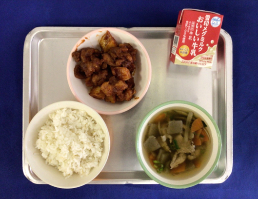 きょうの給食【今日の献立】発芽玄米入り、ごはん、牛乳、鶏肉とじゃがいものケチャップ和え、根菜汁