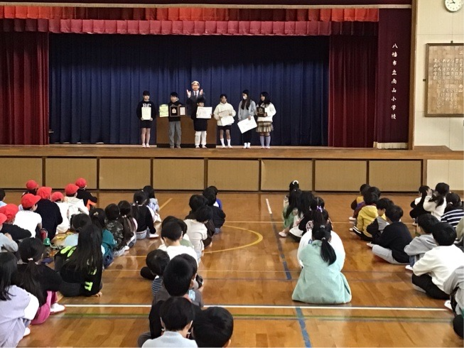 また、学校内外で活躍した児童の表彰も行いました。表彰された児童はみんなの前で名前を呼ばれ、大きな拍手をもらいました。