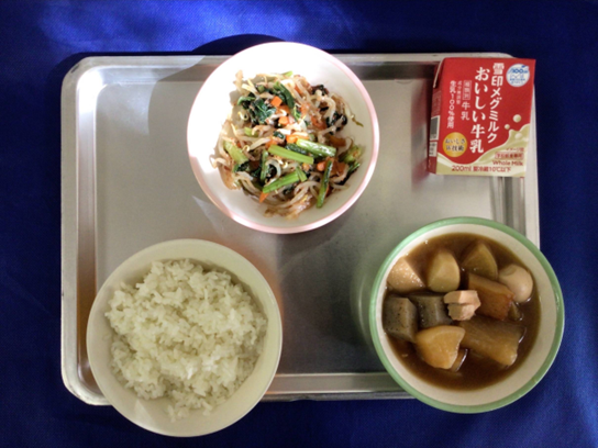 きょうの給食【今日の献立】”ごはん”牛乳”おでん”小松菜ともやしのかつおあえ”