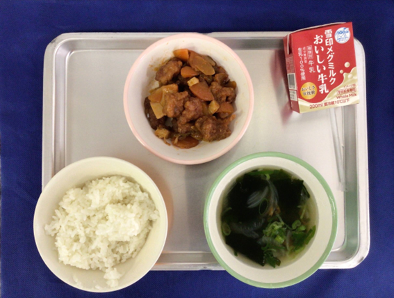 きょうの給食【今日の献立】”ごはん”牛乳”酢豚”わかめスープ
