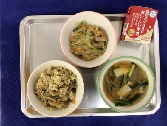 きょうの給食【今日の献立】”中華おこわ”牛乳”ワンタンスープ”春雨サラダ”