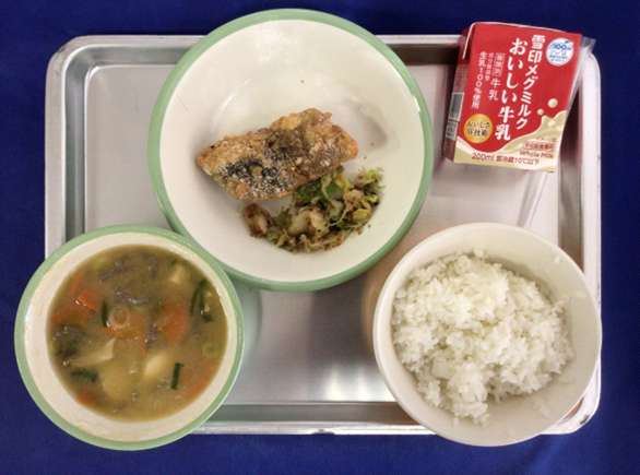 きょうの給食【今日の献立】”ごはん”牛乳”あじの竜田揚げ”はくさいのかつおあえ”いものこ汁”
