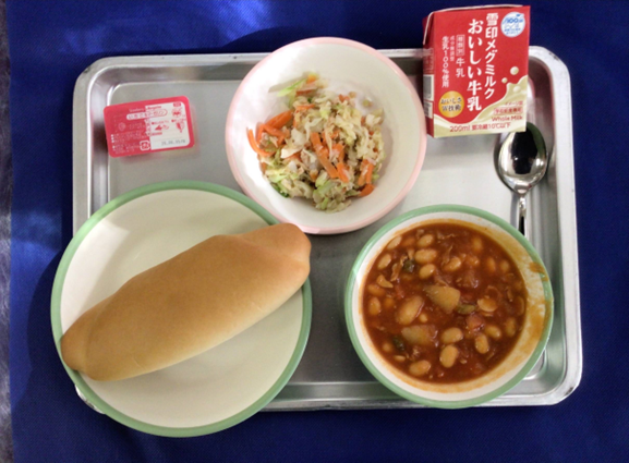 ●今日の献立の「ポークビーンズ」には大豆がたっぷり入っていました。大豆は「畑の肉」といわれ栄養価の高い食品です。大豆をうまく食事に取り入 れて食べてきたことで日本は長寿国になったそうです。コッペパンに苺マーガリンがポークビーンズにぴったりでした。