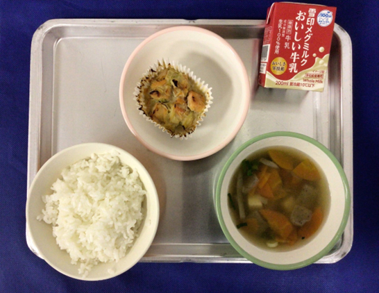 きょうの給食【今日の献立】”ごはん”牛乳”鮭のちゃんちゃん焼き”けんちん汁”
