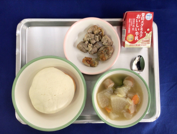 きょうの給食【今日の献立】”味つけコッペパン”牛乳”鶏肉のハーブグリル”冬野菜のポトフ”