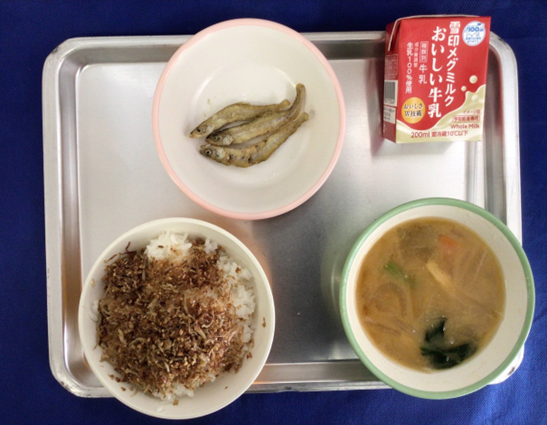 きょうの給食【今日の献立】”ごはん”ふりかけ”牛乳”わかさぎのからあげ”大根と玉ねぎのみそ汁”
