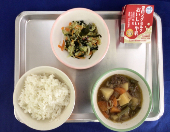 きょうの給食【今日の献立】”ごはん”牛乳”肉じゃが”きゃべつと海藻の酢の物”