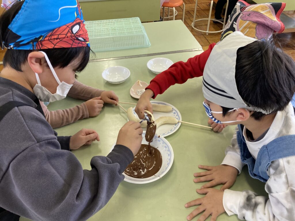 2組はチョコバナナを作りました。チョコが溶けたり固まったりするので、お店で売っているもののように作るのは難しそうでした。食べるときは、みんなにこにこです。