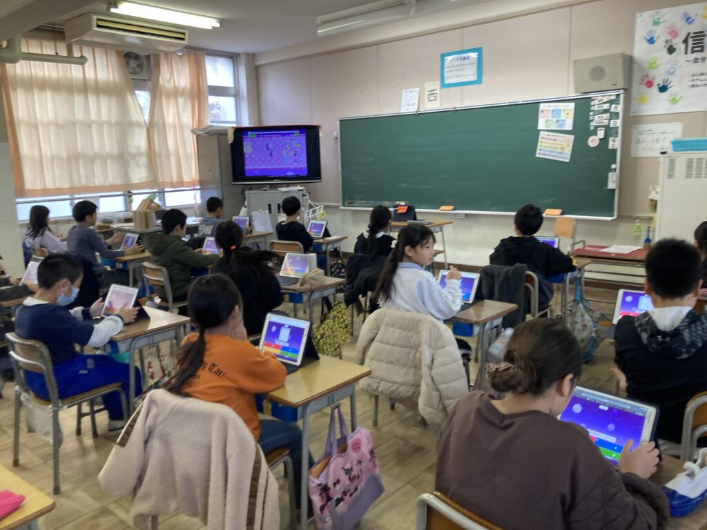 3年生:1組はタブレットを使った学習クイズ。みんなで問題を正解して敵を倒すような内容なので、必死に問題に取り組みました。
