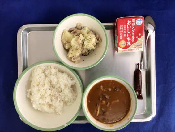 きょうの給食【今日の献立】”ハヤシライス”牛乳”ミルメークココア”ジャーマンポテト”