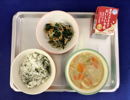 きょうの給食【今日の献立】”菜めしご飯”牛乳”豚肉と白菜の豆乳煮”ほうれん草ともやしのナムル”