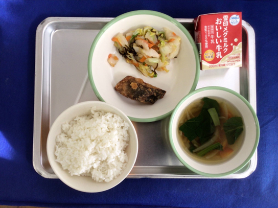 きょうの給食【今日の献立】”ごはん”牛乳”あじの竜田揚げ”白菜の塩昆布あえ”野菜のすまし汁”