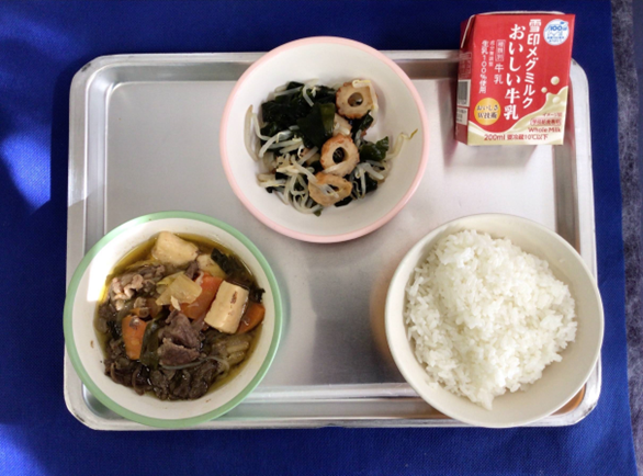 きょうの給食【今日の給食】”ごはん”牛乳”すき焼き”わかめともやしの酢の物”