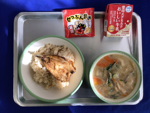 きょうの給食【今日の給食】”いわしのかば焼き丼”牛乳”かす汁”節分豆
