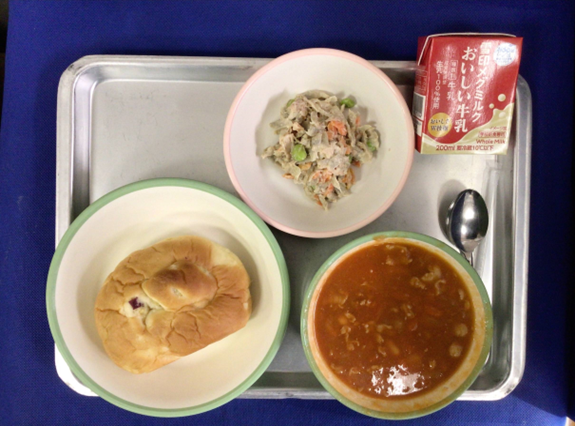 きょうの給食【今日の給食】”おさつパン”牛乳”ポークビーンズ”ごぼうのサラダ”