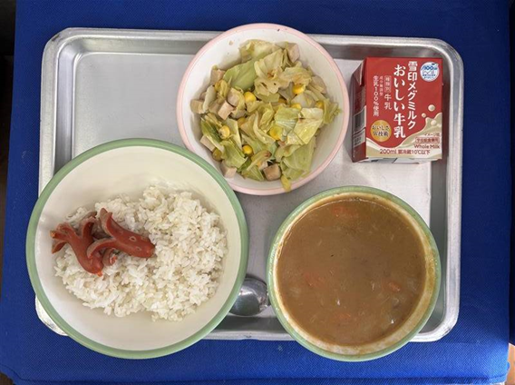 きょうの給食【今日の給食】”カレーライスウインナー”トッピング”牛乳”キャベツとハムのソテー”