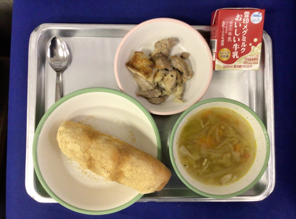 〇今日の給食は子どもたちが大好きな「きな粉ぱん」でした。パンを油をあげて、きな粉と砂糖をまぶしたものです。鶏肉のハーブグリルの香料がとてもいいにおいがして柔らかいお肉がおいしかったです。ベジタブルスープも体が温まりました。ごちそうさまでした。