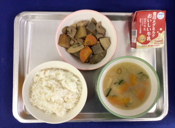 きょうの給食【今日の献立】”発芽玄米入りごはん”牛乳”筑前煮”小切干大根のみそ汁”