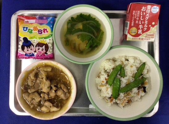 きょうの給食【今日の献立】”ちらし寿司”牛乳”鶏肉の照り焼き”菜の花のすまし汁”ひなあられ”