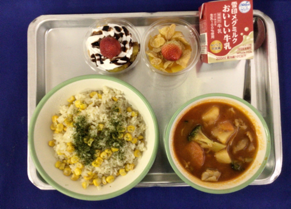 きょうの給食【今日の献立】”コーンライス”牛乳”じゃがいもと鶏肉のトマト煮”フルーツパフェ”