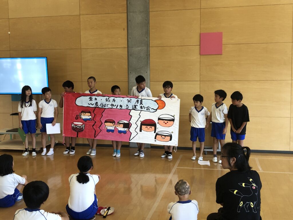 次に、運動会のパネルが完成したので、みんなに披露しました。児童会が考えた運動会のスローガンをイメージして、パネル係が作りました。