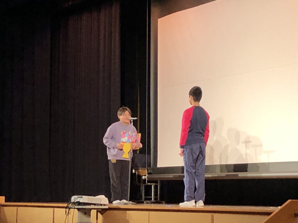 学年で考えた出し物の発表やなかよし班で作ったプレゼント渡し、教職員からのメッセージを6年生に披露しました。よい雰囲気の中で、感謝の気持ちや励ましの気持ちを持って6年生を送りだしてくれました。