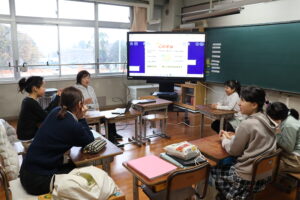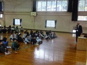 体育館で行いました。いろいろな行事や取組みの様子やアンケート結果をもとに振り返りました。