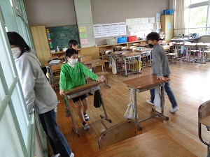 中学年が4年生教室に集まり、これからの動きについて確認しています。座席が足りなくても大丈夫!4年生が3年生に「ここに座って」と声をかけ、自分たちは床に座るなどの優しい心遣いを見せていました。