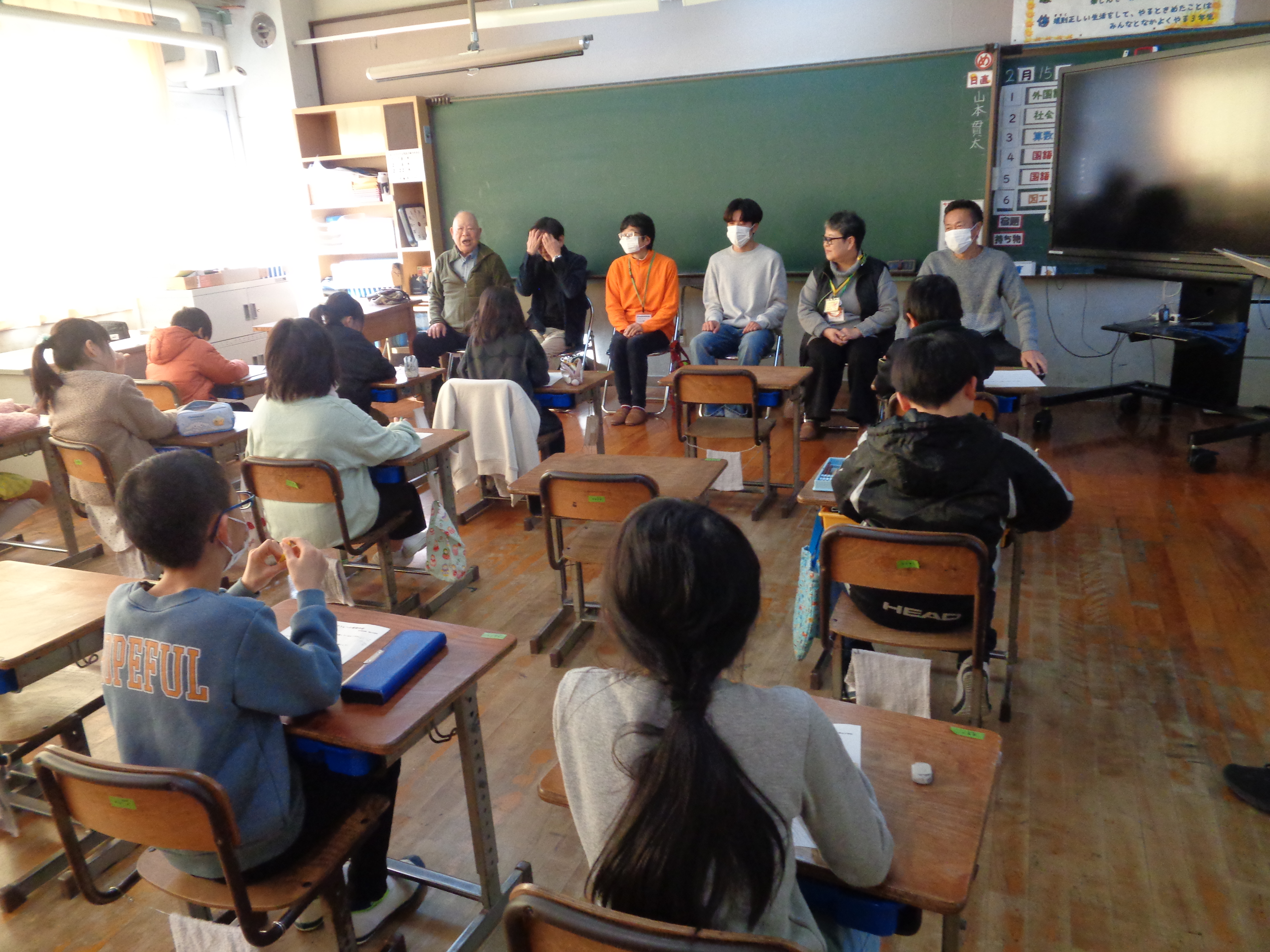 2月15日に峰山学園のこども園から年長児さんが体験入学にやってきました。少し緊張気味でしたが、1年生の元気のよい歓迎を受け、徐々にリラックスしていく姿が見られました。