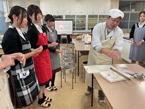 実習では、お正月に親しまれる「花びら餅」と「きんとん」を作りました。「花びら餅」は白と薄紅色の求肥で味噌あんとゴボウを包む、上品な京菓子です。「きんとん」は、色鮮やかなそぼろ状の生地で餡をまとった華やかな和菓子で、今回は糯米粉を雪に見立てて散らしました。見た目にも美しく、作る過程で細やかな手仕事の大切さを実感することができました。さらに、家庭でも挑戦できる簡単なレシピも教えていただき、生徒たちは「家族にも作ってみたい!」と意欲を見せていました。