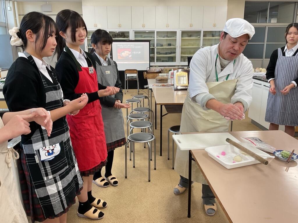 講師としてお迎えしたのは、与謝野町で長年和菓子店を営み、伝統の技を守り続けておられる職人さんです。和菓子作りの実演を交えながら、和菓子の歴史と意味、そして職人としてのこだわりや技術についてもお話しいただき、参加した生徒たちは熱心に耳を傾けていました。