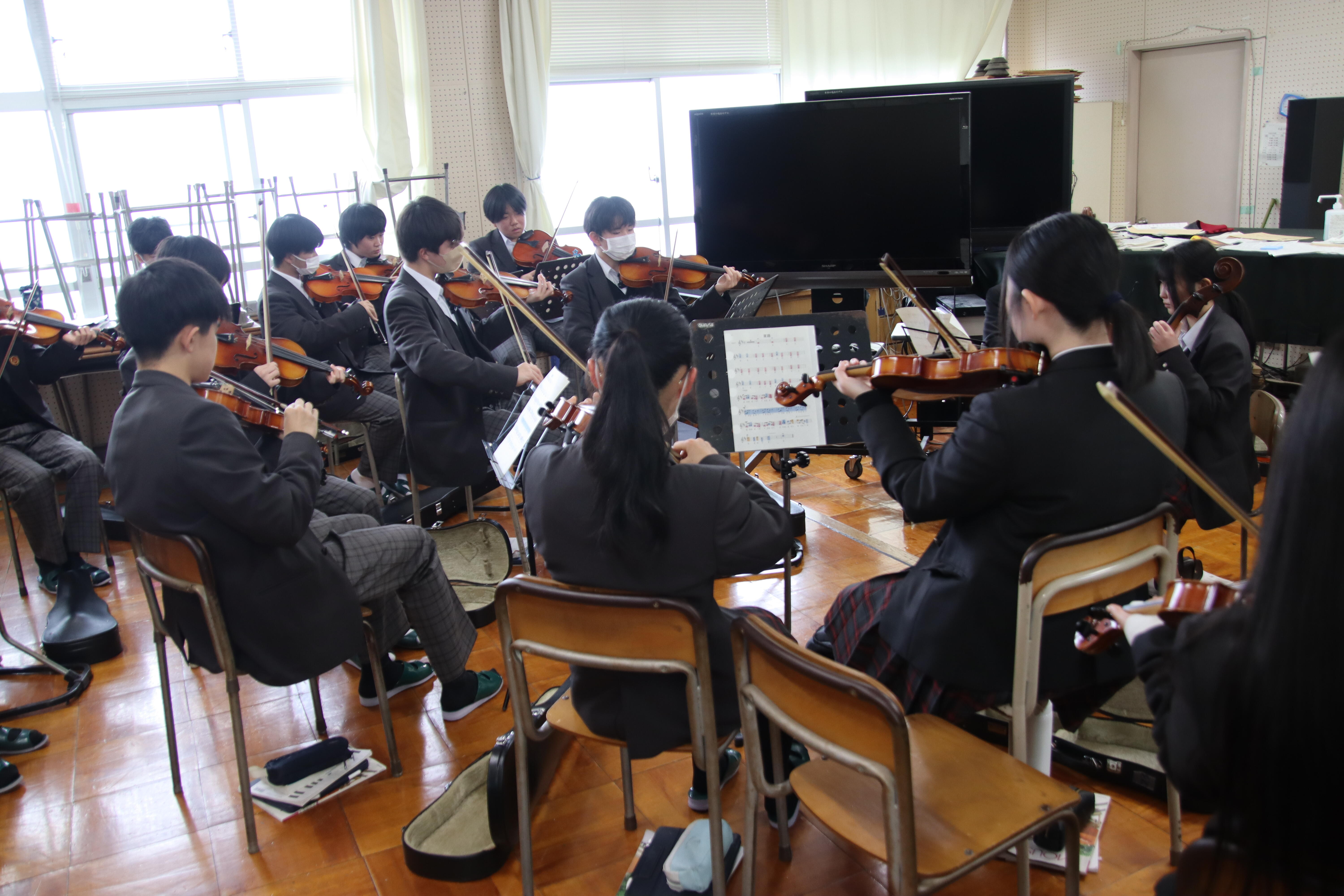 今回は、新たな取組の一つである音楽選択者の「オーケストラ発表」に向けた授業での練習の様子を紹介します。