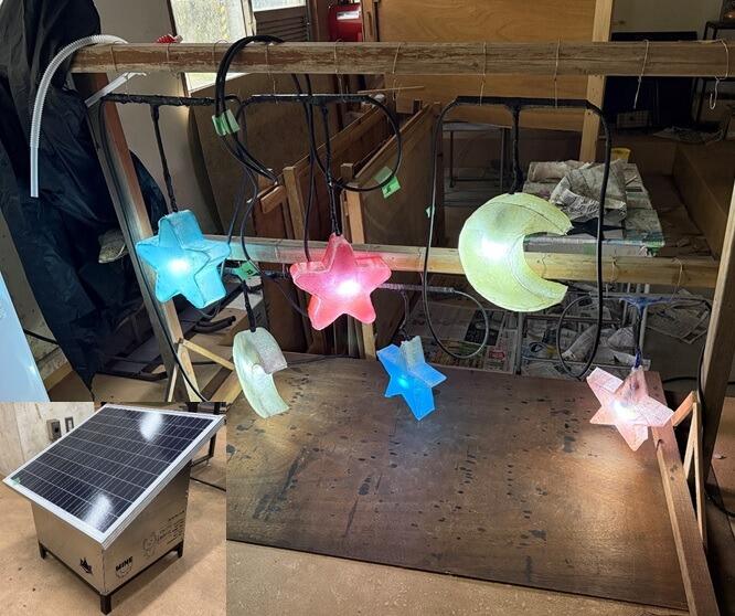 「中庭を勉強や部活動の癒しになるような場所にする」をコンセプトに、星や月の吊り下げ式のイルミネーションを製作しました。