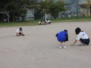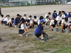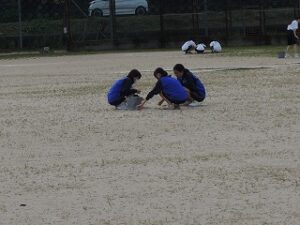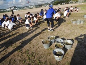 体育祭に向け、任務係が中心となり、放課後のグラウンドの草抜きボランティアを呼び掛けています。各ブロックごとに草取りをする場所が示され、抜いた草の量を各ブロックごとに集約していきます。陽が差し、暑い中でしたがみんなで協力して一生懸命作業に取り組みました。29日、30日の2日間作業を行う予定です。