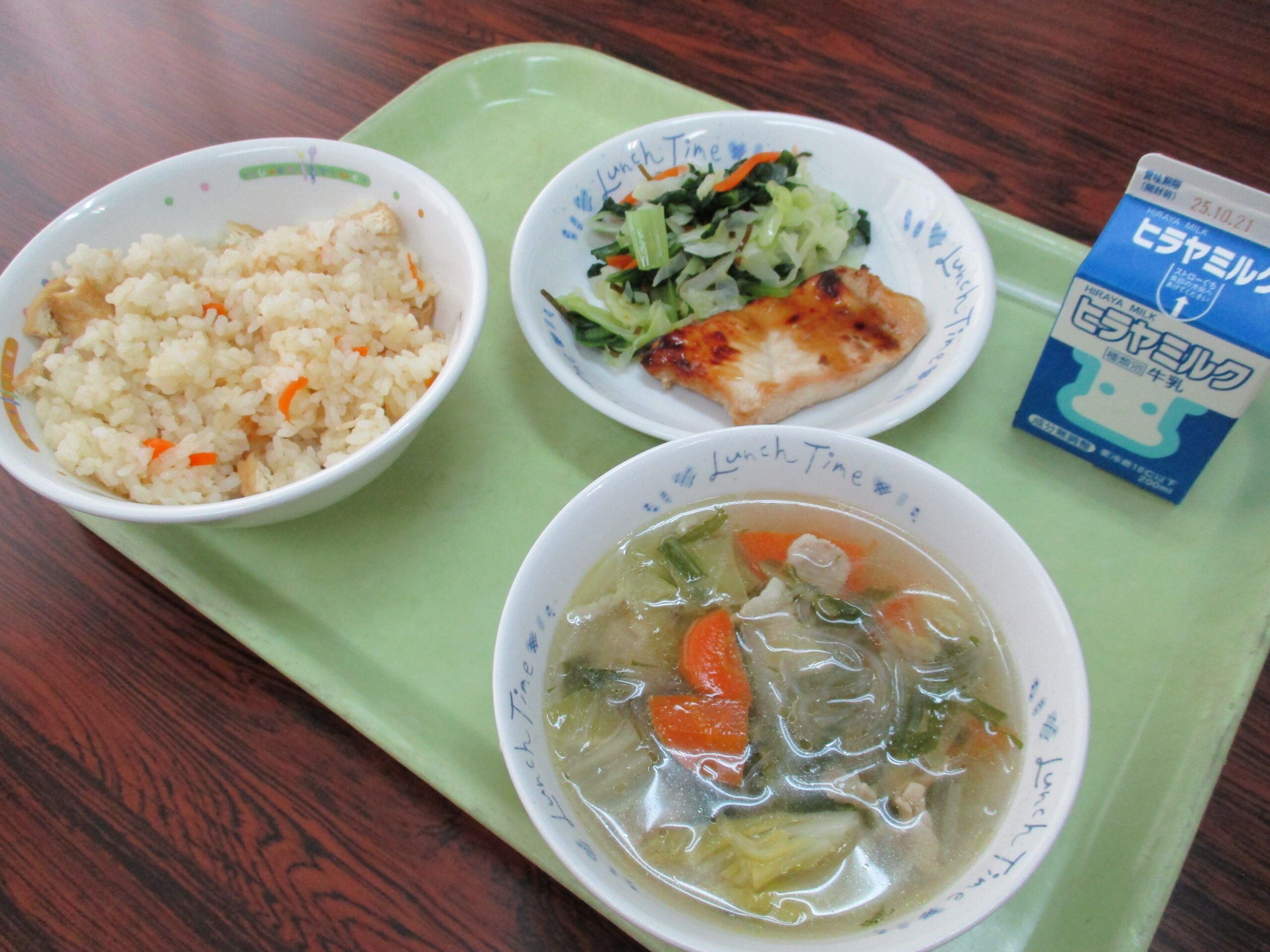 今日は「みかんごはん」を炊きました。献立表でこの名前を見て「どんなごはん?!」と気にして(心配して?)いた人も多かったようです。みかんごはんは愛媛県の料理で、簡単に言うとみかんジュースを少し混ぜて炊いた炊き込みご飯です。ですから、みかんの味はほとんどせずほのかにみかんの香りがする普通の炊き込みごはんでした。